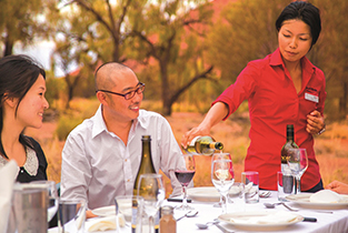 - スパークリングワインやおつまみを楽しみながら、夕日に照らされ色が変化していくウルルの壮大な姿を堪能します。(約40分) その後ホテルへ。