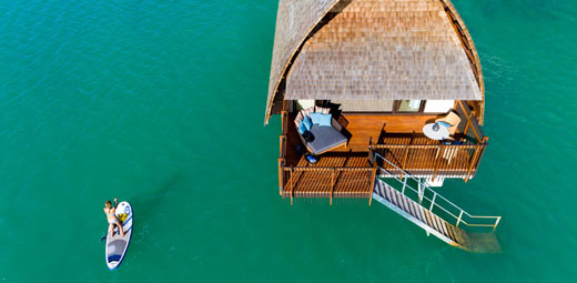ラグーンに建つ水上バンガローです。宿泊者は18歳以上の大人限定で、キングサイズベッド、楕円形のバスタブ、デッキから直接ラグーンへ降りる階段が備わっています。