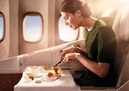 ビジネスクラスでは健康志向の料理に舌つづみ。シャンパンも無料サービス。 ビジネスクラス向けに、エミレーツが誇る敏腕シェフが、各種の健康食メニューをご用意しております。食材本来の風味と栄養分を活かしつつ、飽和脂肪酸やトランス脂肪酸、塩分や糖分を抑えています。ロイヤル・ドルトンの食器 (ファイン・ボーン・チャイナ)、ロバート・ウェルチのフォークやナイフで饗します。いずれの食事でも、シャンパンや極上のワイン、カクテルその他のお飲み物は無料です。(ただし、サウジアラビア路線ではアルコール類は提供されまん。)数々の受賞実績のある洗練されたお食事と素晴らしいサービスを、ゆったりとおくつろぎながらお楽しみください。